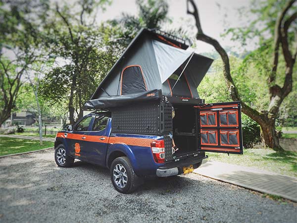 AluCab Canopy Camper for 2 adults and 1 kid. It features a small cabin in the back with a 50l water tank, USB and 12V connector and reading lamps.